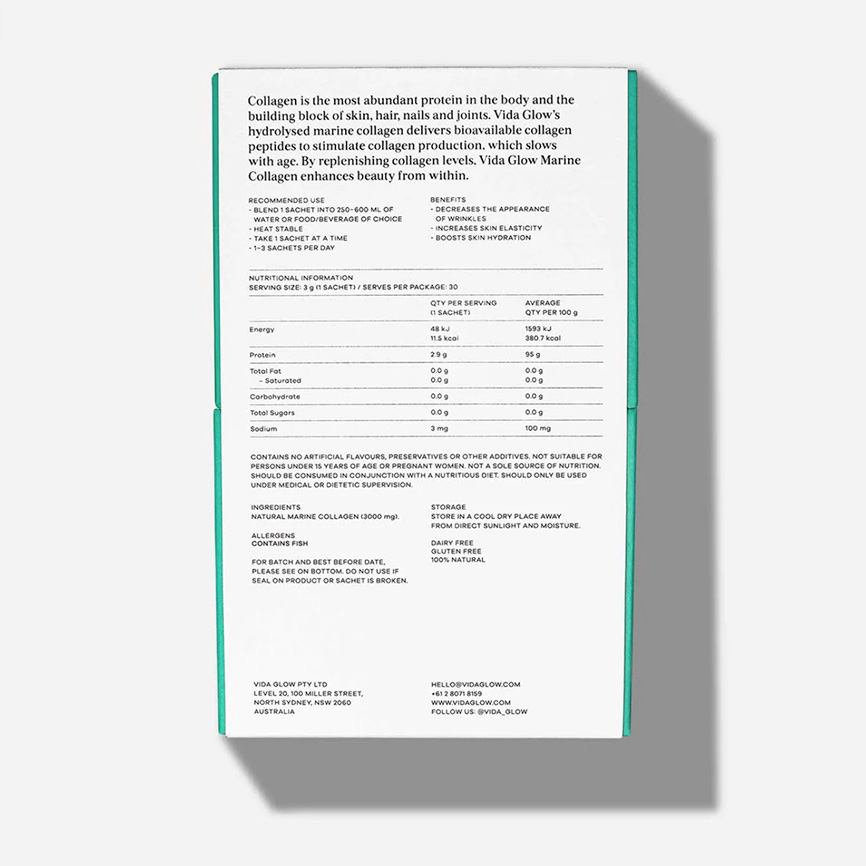 - 3g of Natural Marine Collagen peptides per sachet
